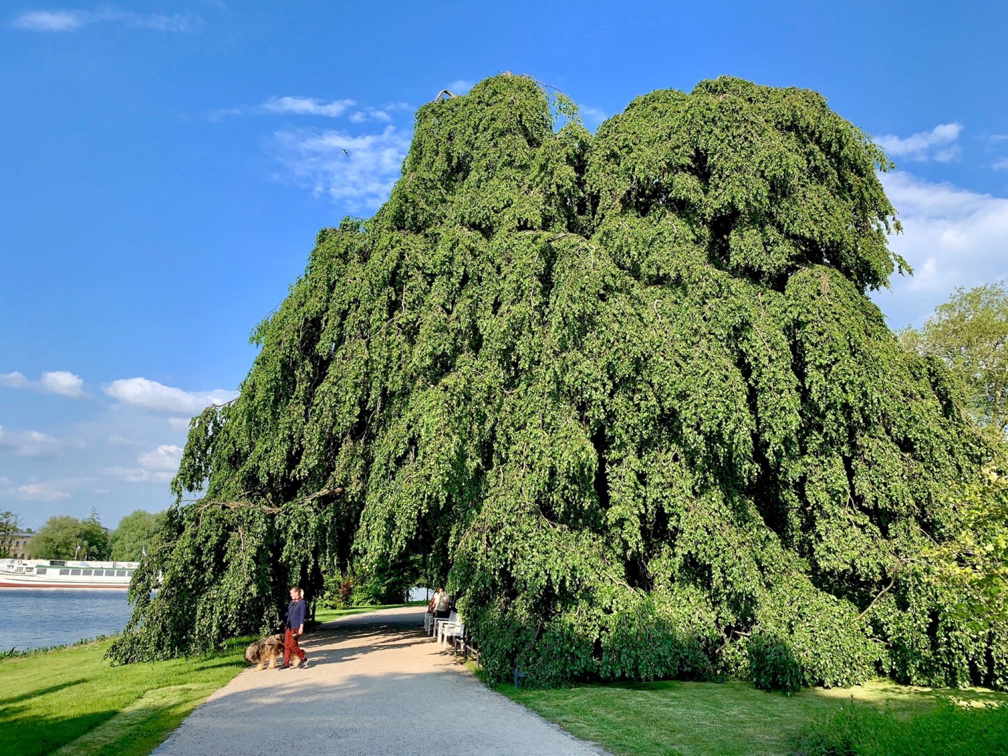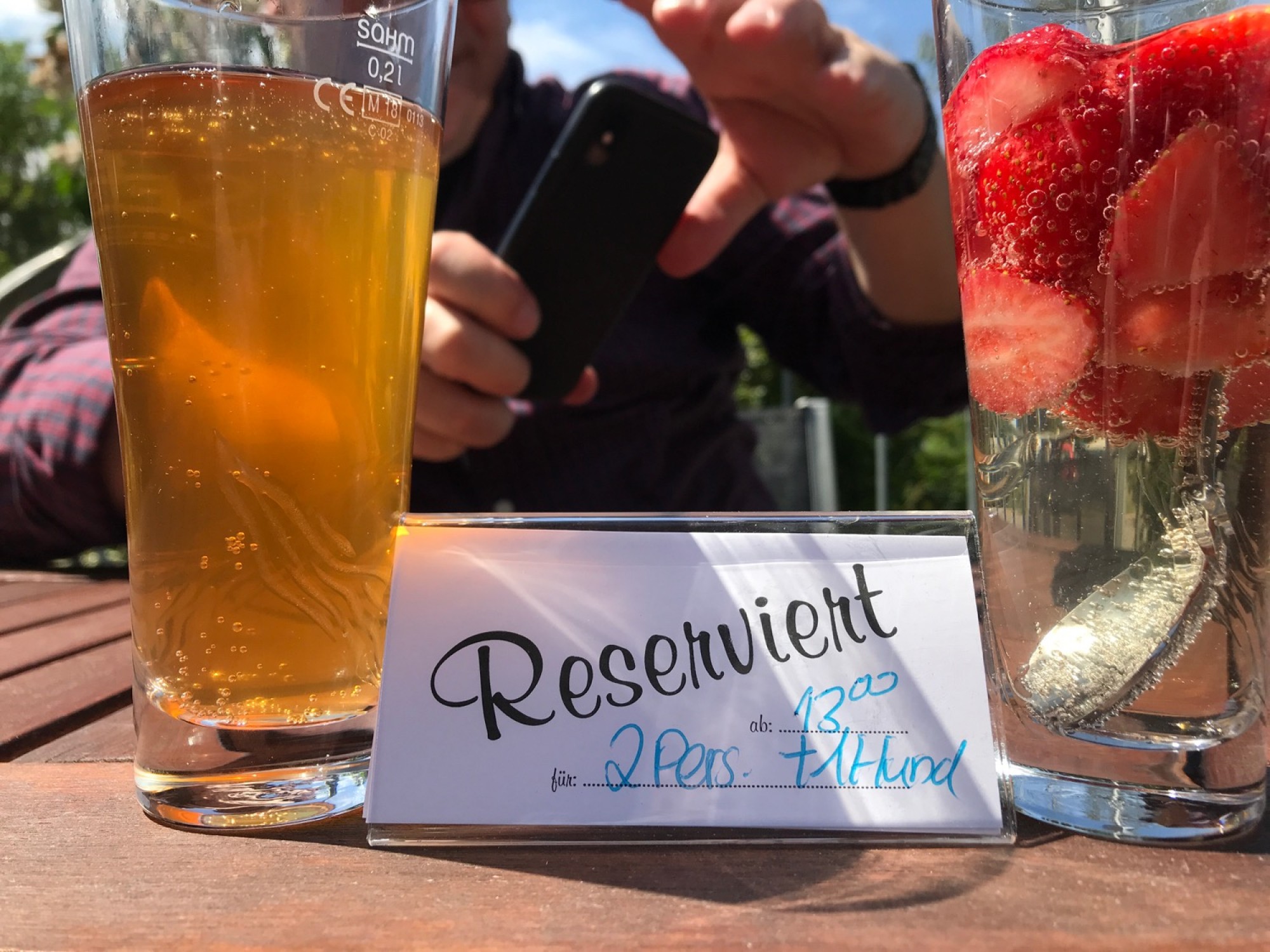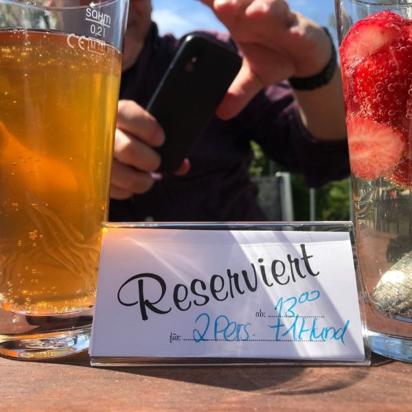 Schönstes Wetter Ende Mai schon auf der Anreise. Herrchen hat uns auf halbem Weg eine Gaststätte fürs Mittagessen reserviert, 13 Uhr 2 Personen und EIN HUND! Das haben wir ja noch nie erlebt. Und der Tisch war schon von Weitem am großen Wassernapf zu erkennen.